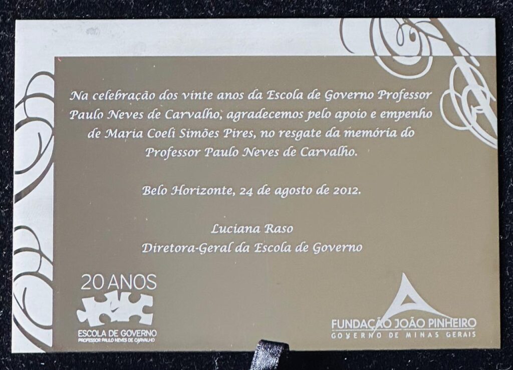 25. – Placa de Agradecimento, Escola de Governo Professor Paulo Neves de Carvalho, Fundação João Pinheiro, 24 de agosto de 2012.