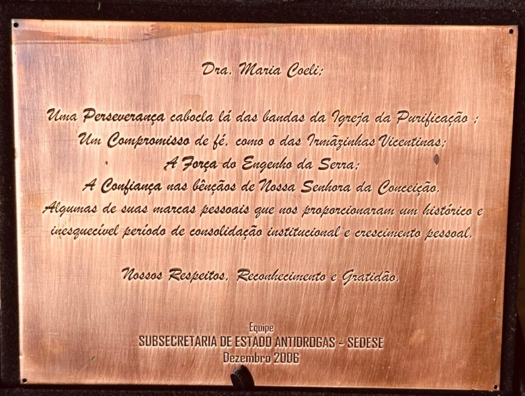 10. – Placa de Homenagem, Subsecretaria de Estado Antidrogas – SEDESE-MG, dezembro de 2006.