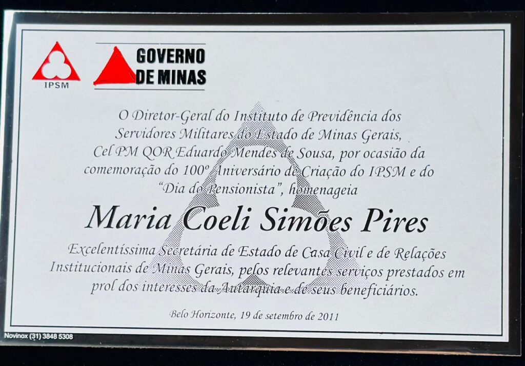 19. – Placa de Homenagem pelos 100 anos do Instituto de Previdência dos Servidores Militares do Estado de Minas Gerais, 19 de setembro e 2011.